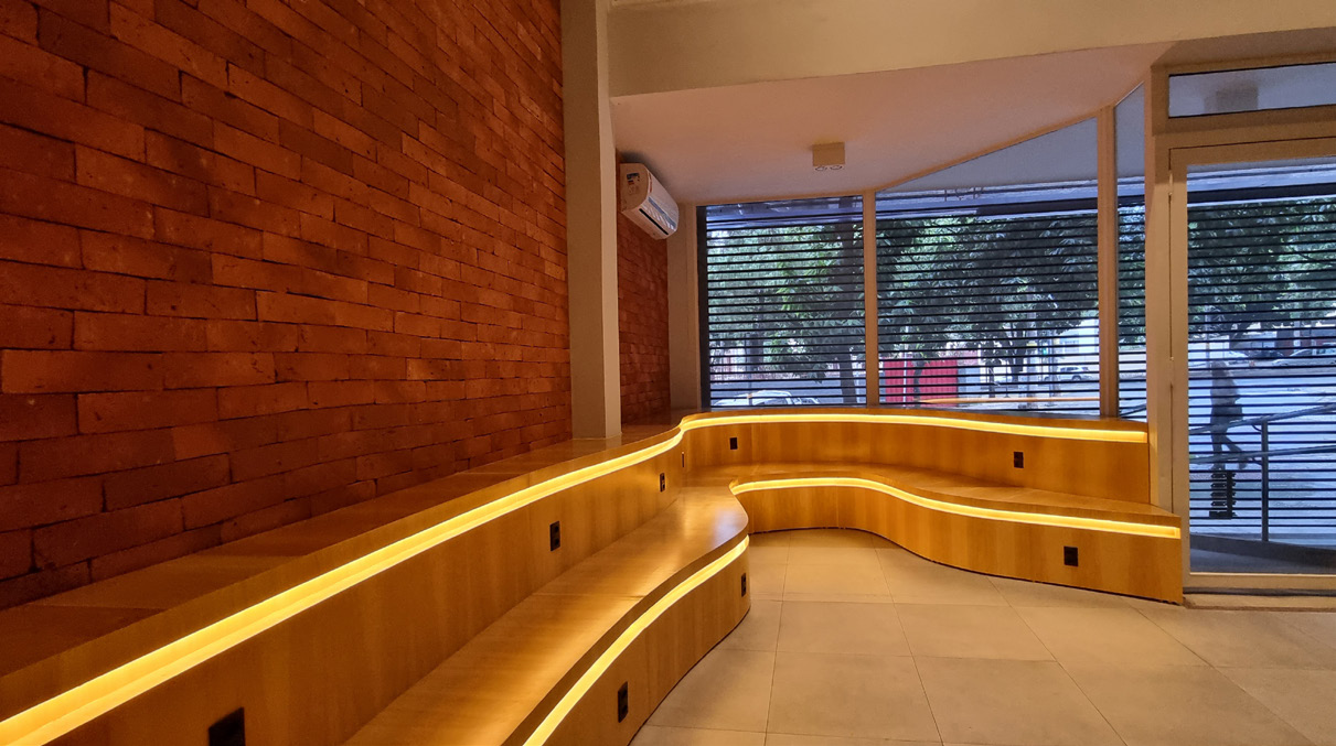 O desejo do presidente era ter a sua sala integrada com as dos funcionários, possibilitando uma comunicação direta entre eles. Para isso, a sala da diretoria foi inserida no eixo central, entre as duas estações de trabalho, e possui uma porta de correr que separa os dois ambientes, sendo ela a ferramenta que possibilita tanto a integração entre as salas quanto a privacidade da diretoria. A recepção é conjunta e o mobiliário foi desenvolvido especialmente para o projeto.
