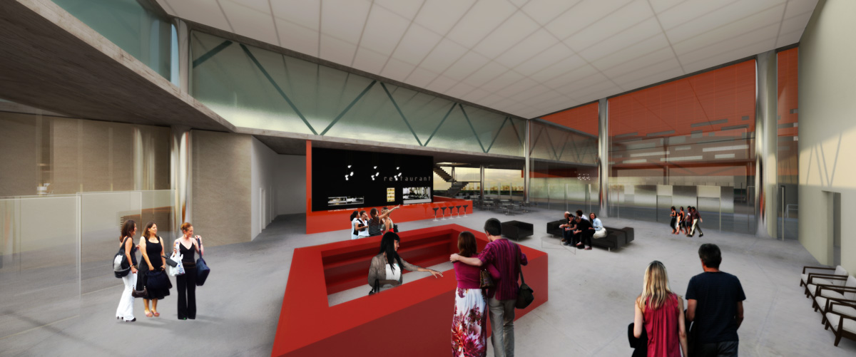 O Foyer além de ser o acesso principal funciona como articulador do fluxo: a ele se conectam todos os ambientes do edifício. Ao lado direito encontra-se o auditório que equipado de painéis retráteis pode ser divido em dois ambientes. Ao lado do auditório estão as salas de reunião, elas contam com aberturas para um jardim interno que além de funcionar como área de vivência cria-se uma barreira para o som que vem da estrada.